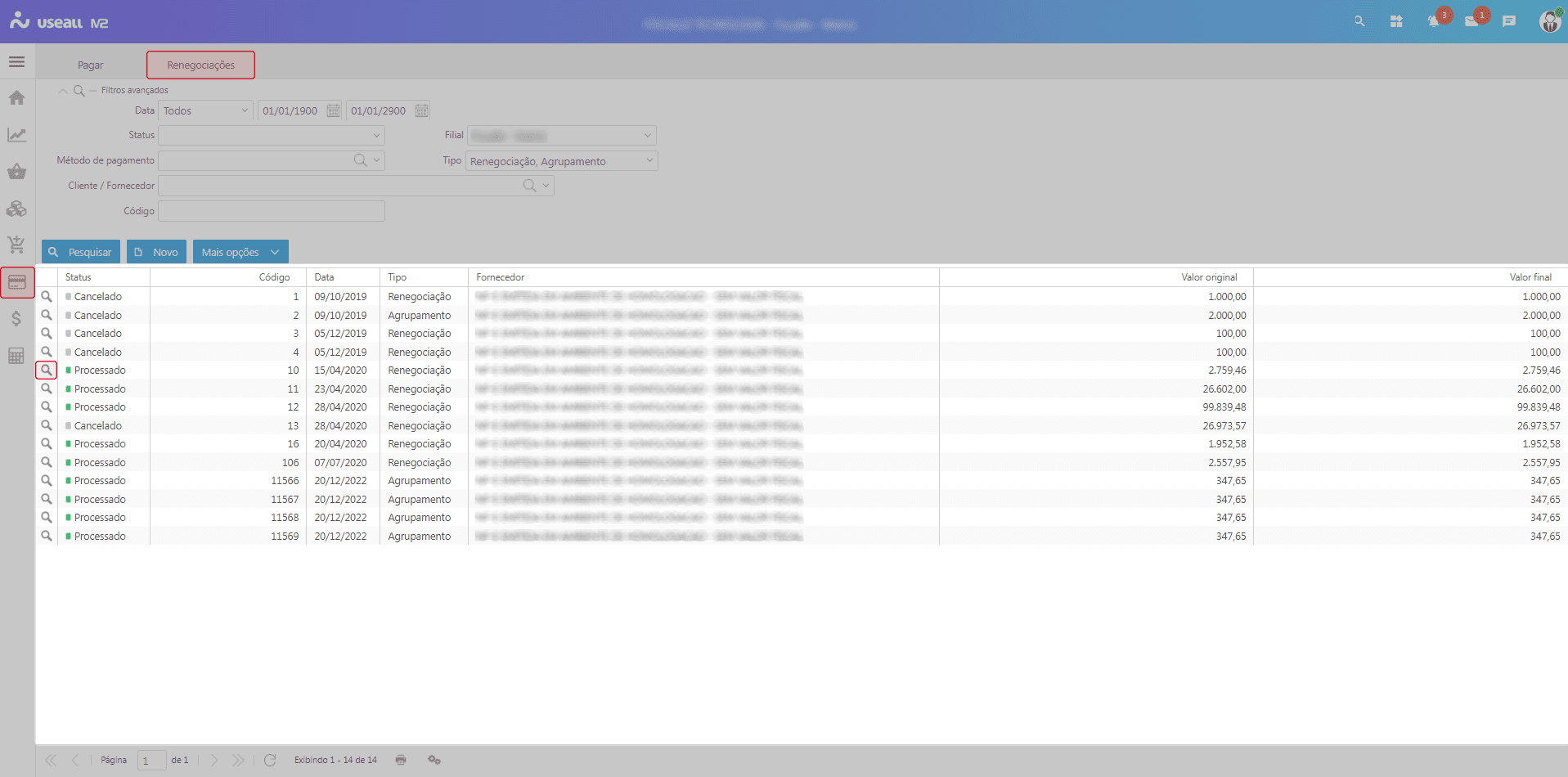 ao clicar nesse ícone ou dar duplo clique na linha do registro, a tela Renegociações de contas a pagar será exibida, permitindo a visualização das informações correspondentes à renegociação dos títulos selecionados.