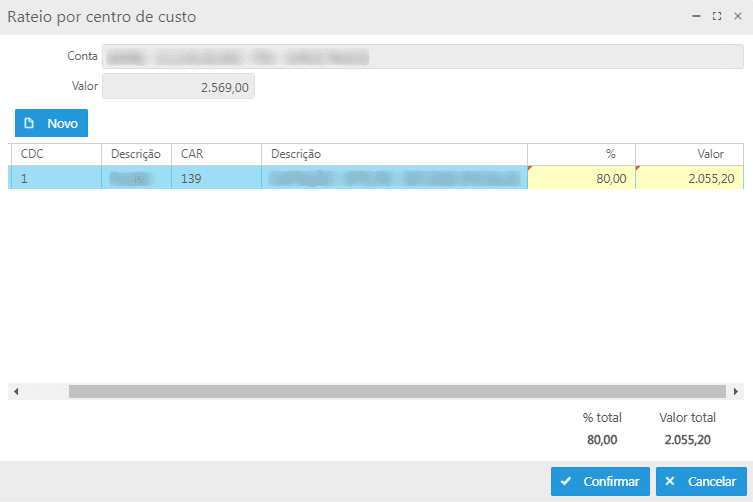 No campo CDC, quando estiver preenchido e clicar no link correspondente, a tela Rateio por centro de custo será exibida, permitindo a edição do rateio ou a criação de um novo.