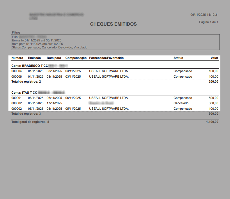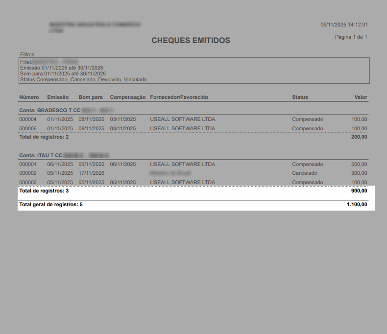 Total geral: apresenta a quantidade total de cheques listados no relatório e o valor total consolidado de todos os registros exibidos.