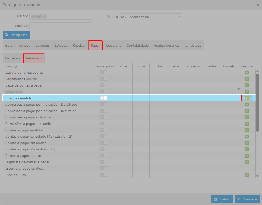 Logado no sistema USEALL deve-se acessar o Módulo Central, opção Usuários, selecionar o usuário que terá a permissão, clicar no botão Mais opções, opção Permissões de sistema. Deve-se clicar na opção configurar do sistema M2-Manufatura, em seguida, acessar o módulo Pagar, aba Relatórios e localizar a seção Cheques emitidos, onde devem ser configuradas as devidas permissões.