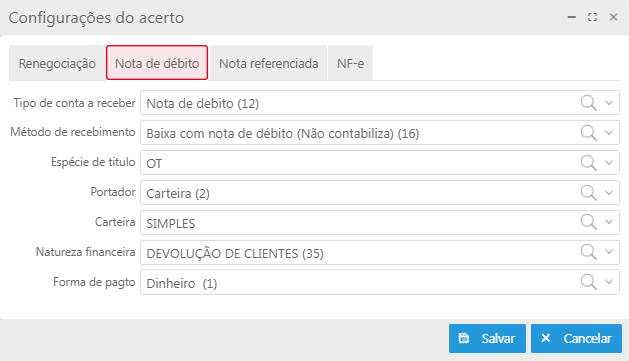 Quando houver notas de débito e elas forem utilizadas, o saldo do acerto será automaticamente abatido.