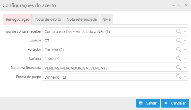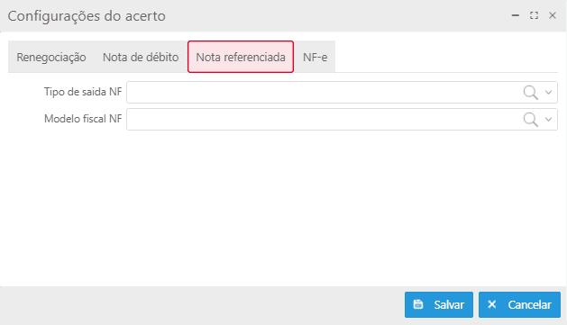 Na tela de consulta do Acerto, deve-se clicar no botão Configurações do Acerto para realizar as configurações prévias necessárias. Essas configurações, que incluem ajustes para renegociação, nota de débito, nota referenciada e NF-e, devem ser concluídas antes de iniciar o processo. A tela de Configurações do Acerto é organizada em abas, o que facilita a configuração de cada aspecto necessário.