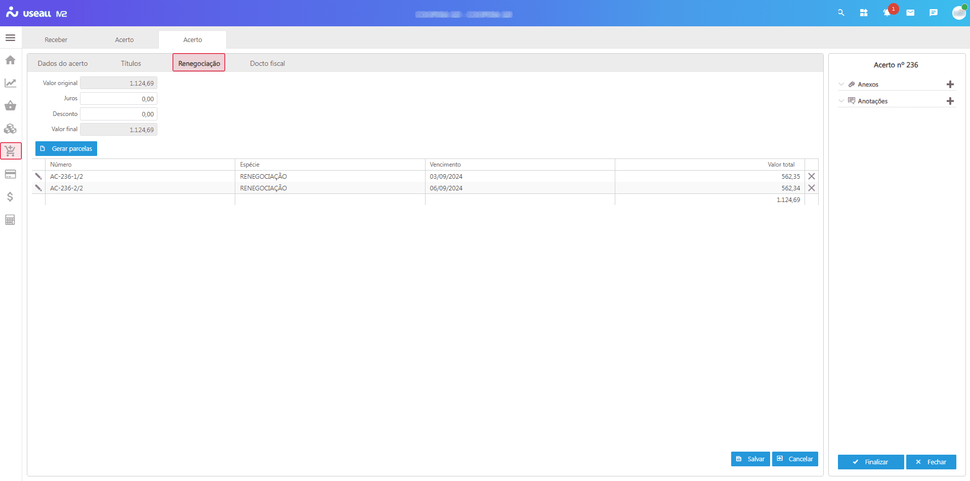 Na aba Renegociação, devem ser geradas as parcelas que substituirão os títulos mencionados anteriormente.
