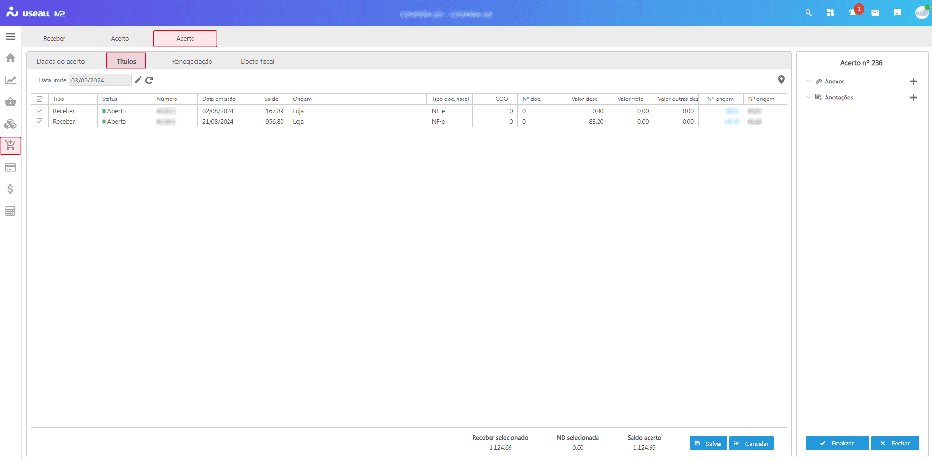 Na aba Títulos, serão listados todos os títulos de contas a receber e notas de débito em aberto para o cliente. Nessa aba, é possível selecionar quais títulos serão renegociados.