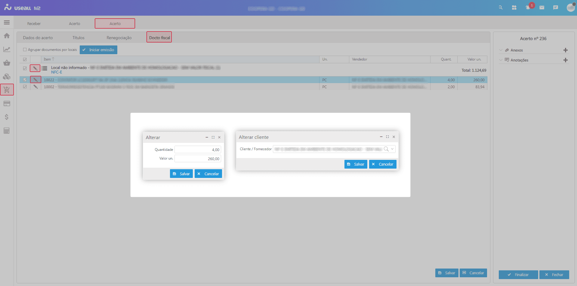 Também será possível alterar o cliente (para inserir o destinatário da prestação de serviços para a qual foram realizadas as vendas) ou as quantidades dos itens. Para isso, basta clicar no ícone da linha correspondente.