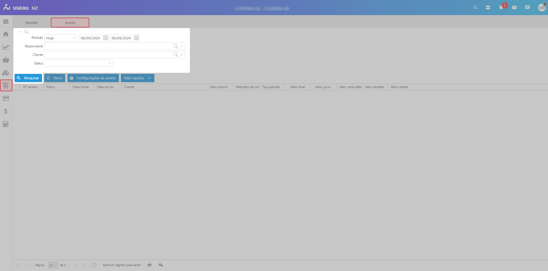 Ao acessar a funcionalidade de Acerto são exibidos os filtros e botão pesquisar, botão Novo, botão Configurações do acerto, grid de informações e o botão mais opções.