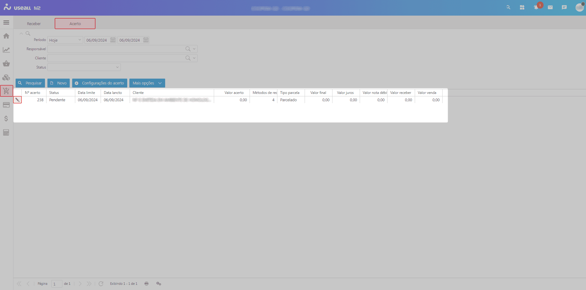 Para cada registro, será apresentado o ícone . Ao clicar nesse ícone ou ao dar dois cliques sobre o registro, a tela de Acerto será exibida, permitindo a alteração das informações.