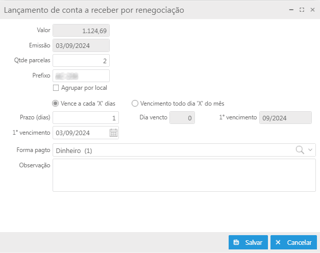 Ao clicar no botão Gerar parcelas, a tela de Lançamento de conta a receber por renegociação será exibida. Caso a quantidade de parcelas seja maior que uma, é possível especificar dados como prefixo, prazo(dias), dia do vencimento, data do primeiro vencimento e também agrupar os títulos por local.