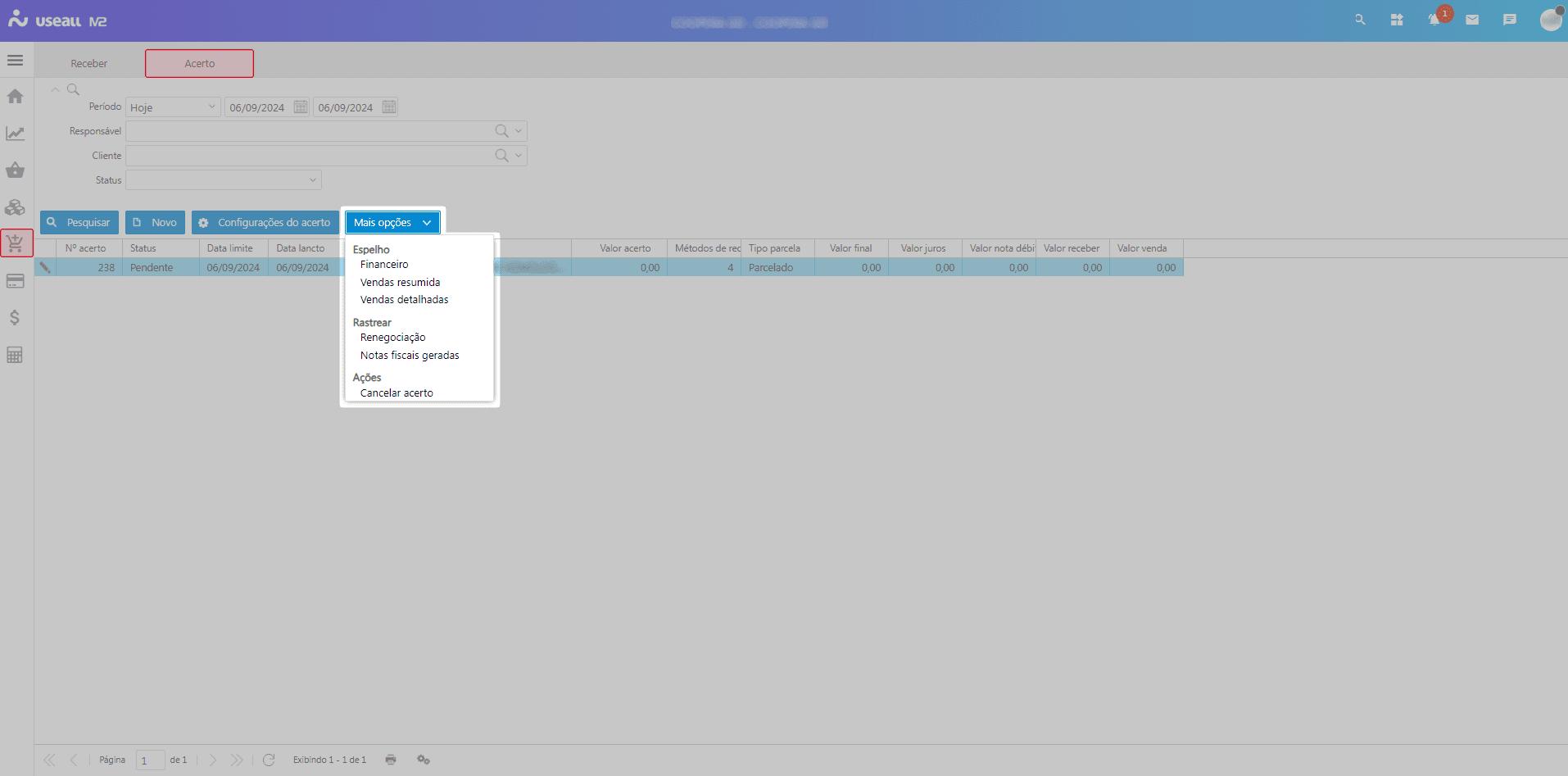 Para iniciar o processo, deve-se acessar: Módulo Receber > Mais opções > Loja - acerto, a tela de consulta do Acerto será exibida.