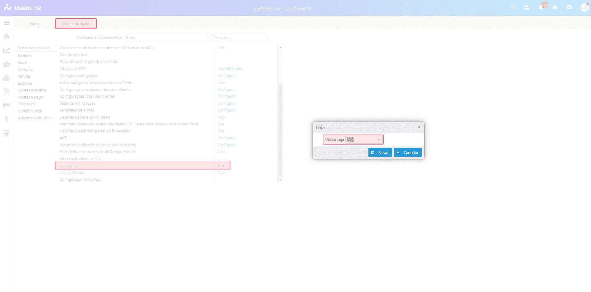 Para utilizar a ferramenta de Acerto, disponível no menu Mais opções do Módulo Receber, é necessário que a parametrização Utilizar Loja esteja ativada. Para habilitá-la deve-se acessar: Iniciar > Parametrização > Comum > Utilizar loja.
