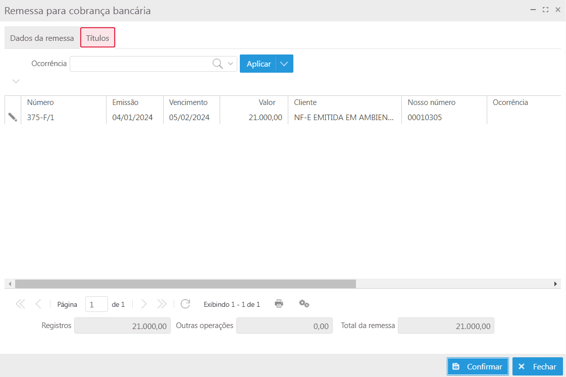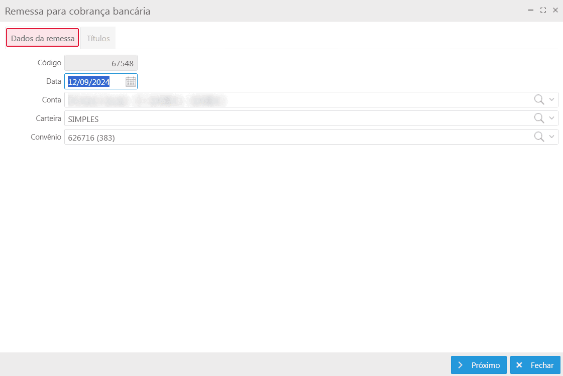 Após selecionar os títulos desejados, basta clicar no botão Gerar remessa e, será apresentada a tela Remessa para cobrança bancária dividida em duas abas: