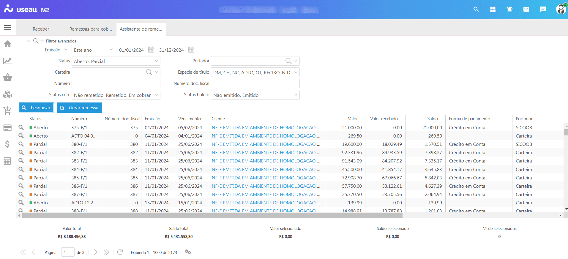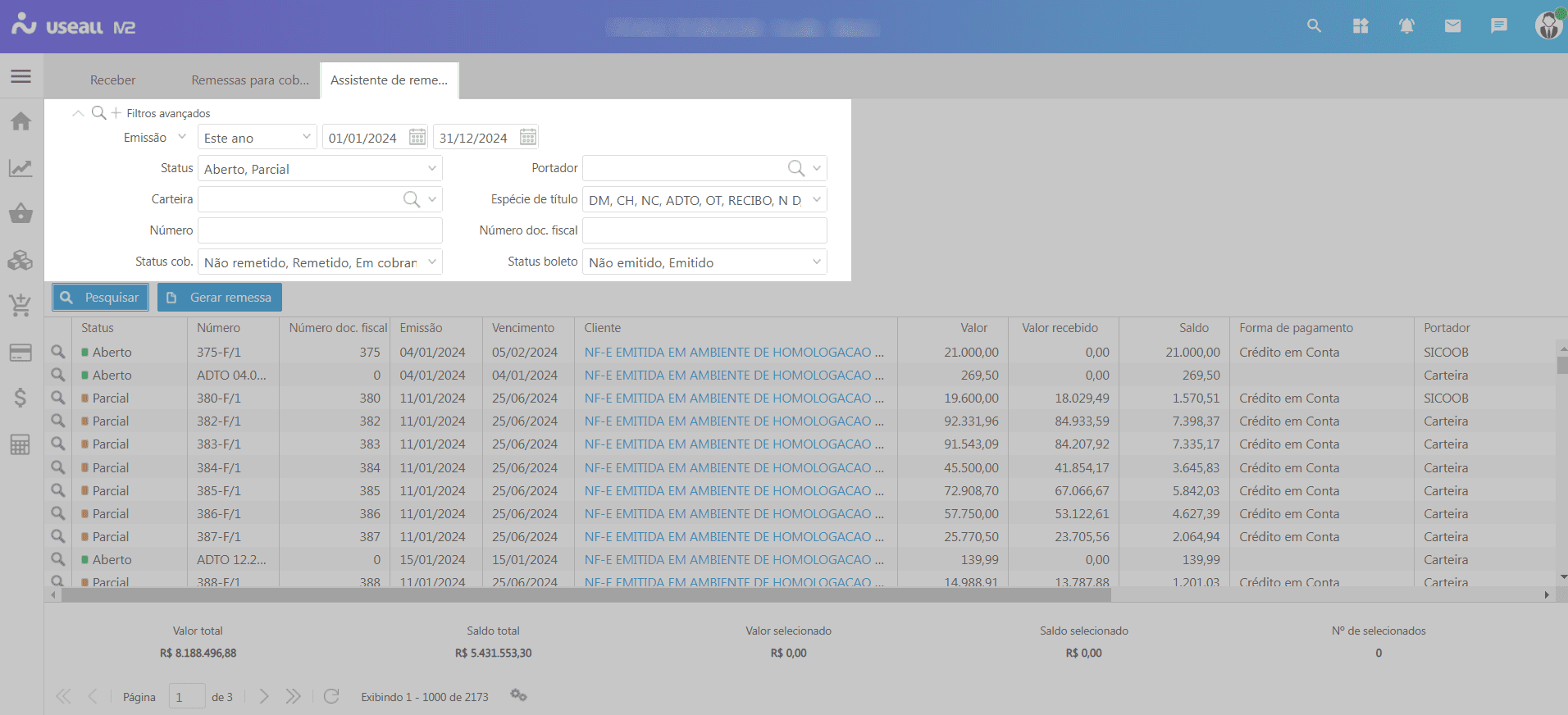 O processo Assistente para gerar remessa bancária permite filtrar e selecionar até mil títulos para inclusão no arquivo de remessa bancária.