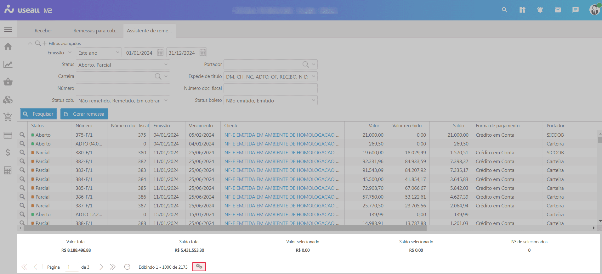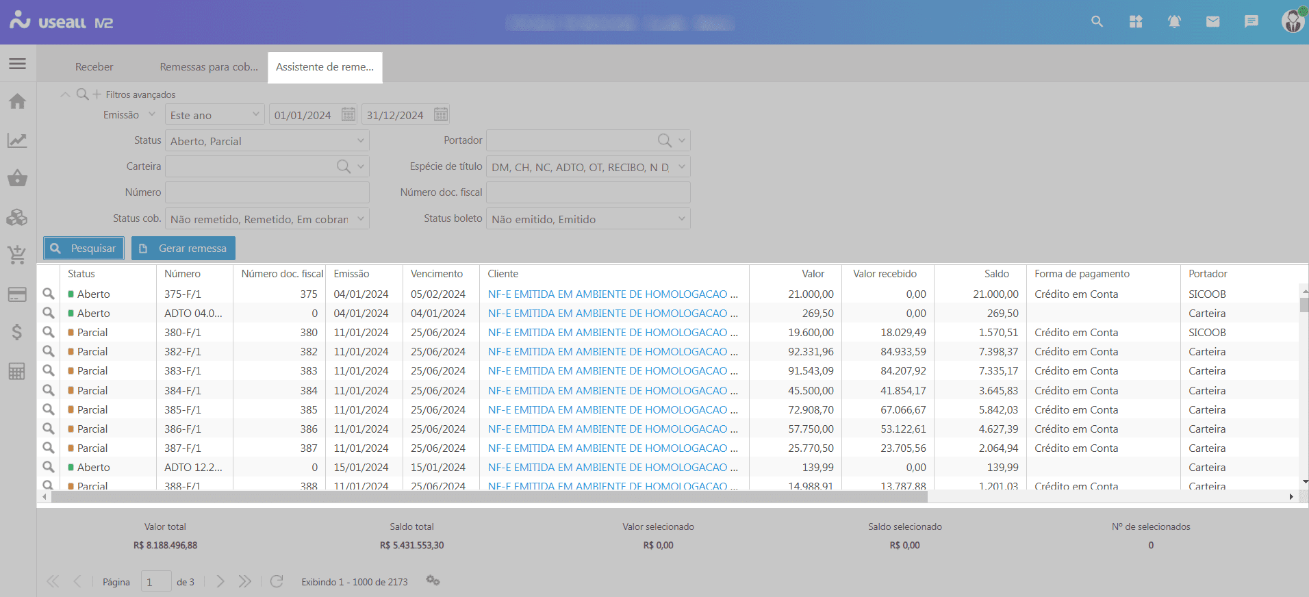 Tem-se também os totalizadores contendo o Valor total, Saldo total, Valor selecionado, Saldo selecionado e Nº de títulos selecionados.