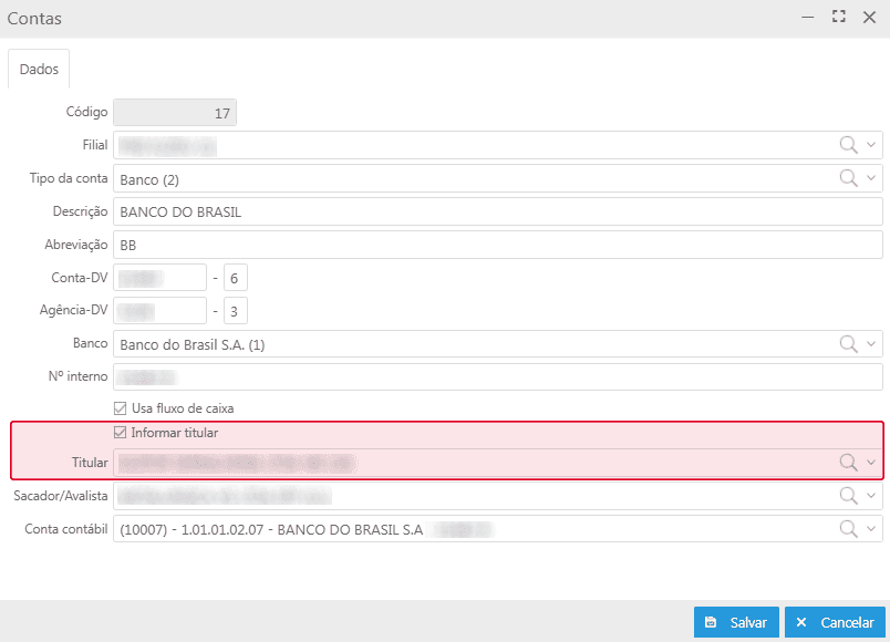 Caso não seja informado o titular no cadastro da conta, será usada a filial que deu origem ao título.