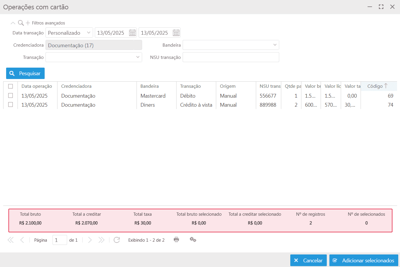 Tem-se o botão Adicionar mais movimentos, permitindo inserir mais registros para a conciliação. Ao clicar nesse botão, o sistema apresenta a tela Operações com cartão, sendo possível pesquisar por mais registros e adiciona-los na conciliação através do botão Adicionar selecionados.