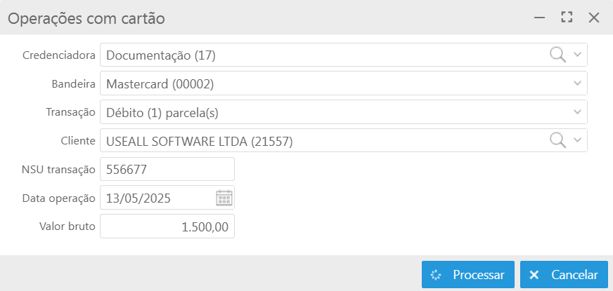 Após o preenchimento, deve-se clicar no botão Processar para concluir o cadastro, onde o registro da operação com cartão será exibido na grid de informações tendo o status Aberto ou Pendente, caso necessite de ajuste.