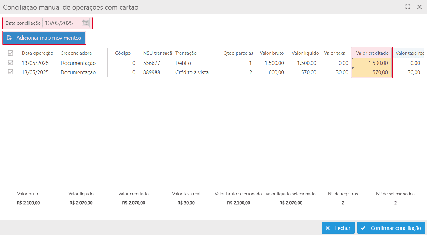 A tela apresenta a lista de operações selecionadas para efetuar a conciliação e os totalizadores informando os totais de valor bruto, valor líquido, valor creditado, valor taxa real, valor bruto selecionado, nº de registros e nº de selecionados. O campo "Valor creditado" (destacado em amarelo) é editável e permite o aumento ou a redução da taxa real. No entanto, não é permitido inserir um valor superior ao valor bruto.