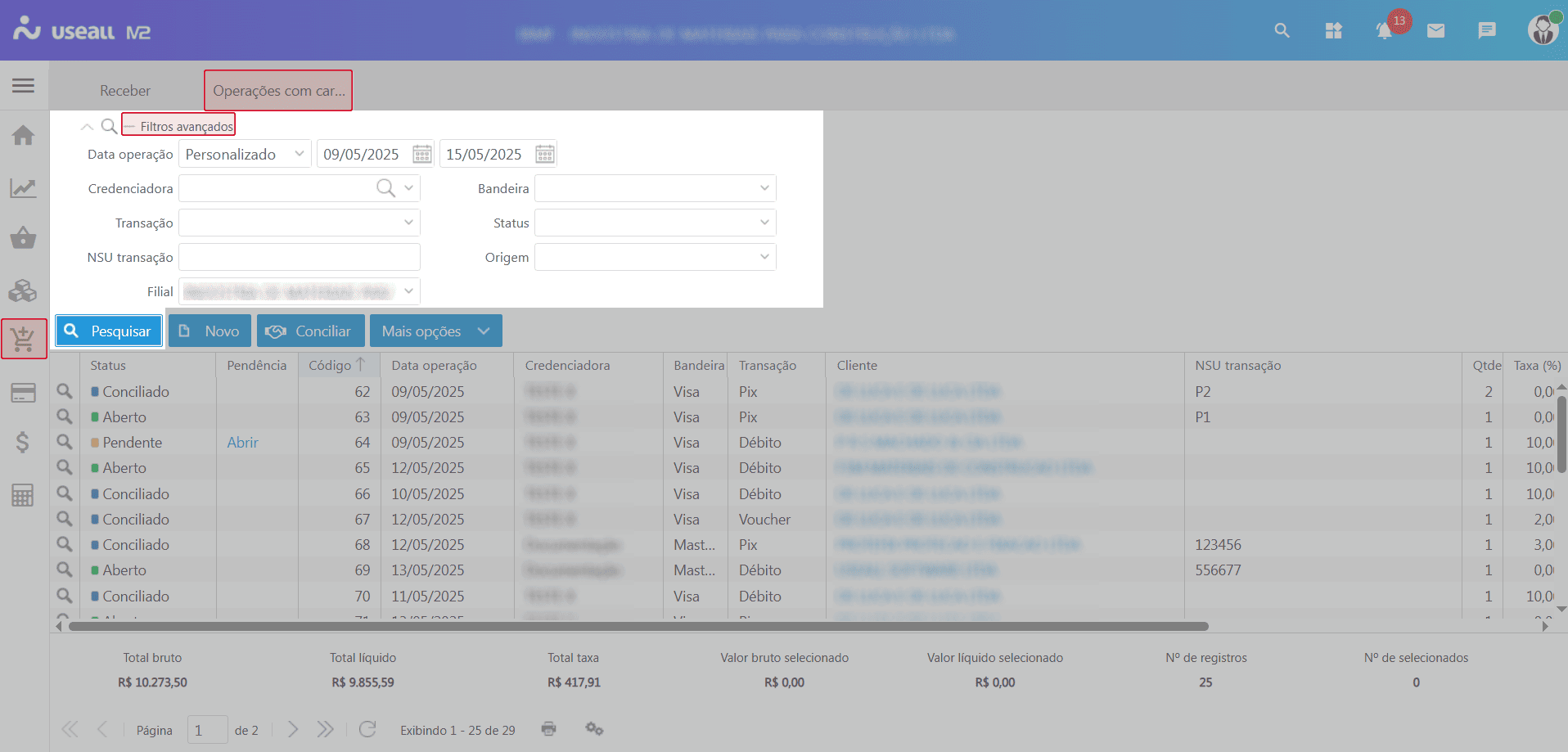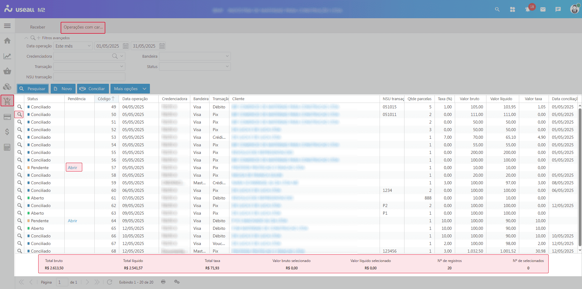 Conciliação: essa ação redireciona para a tela Conciliação de operações com cartão sendo possível realizar a conciliação das operações selecionadas;