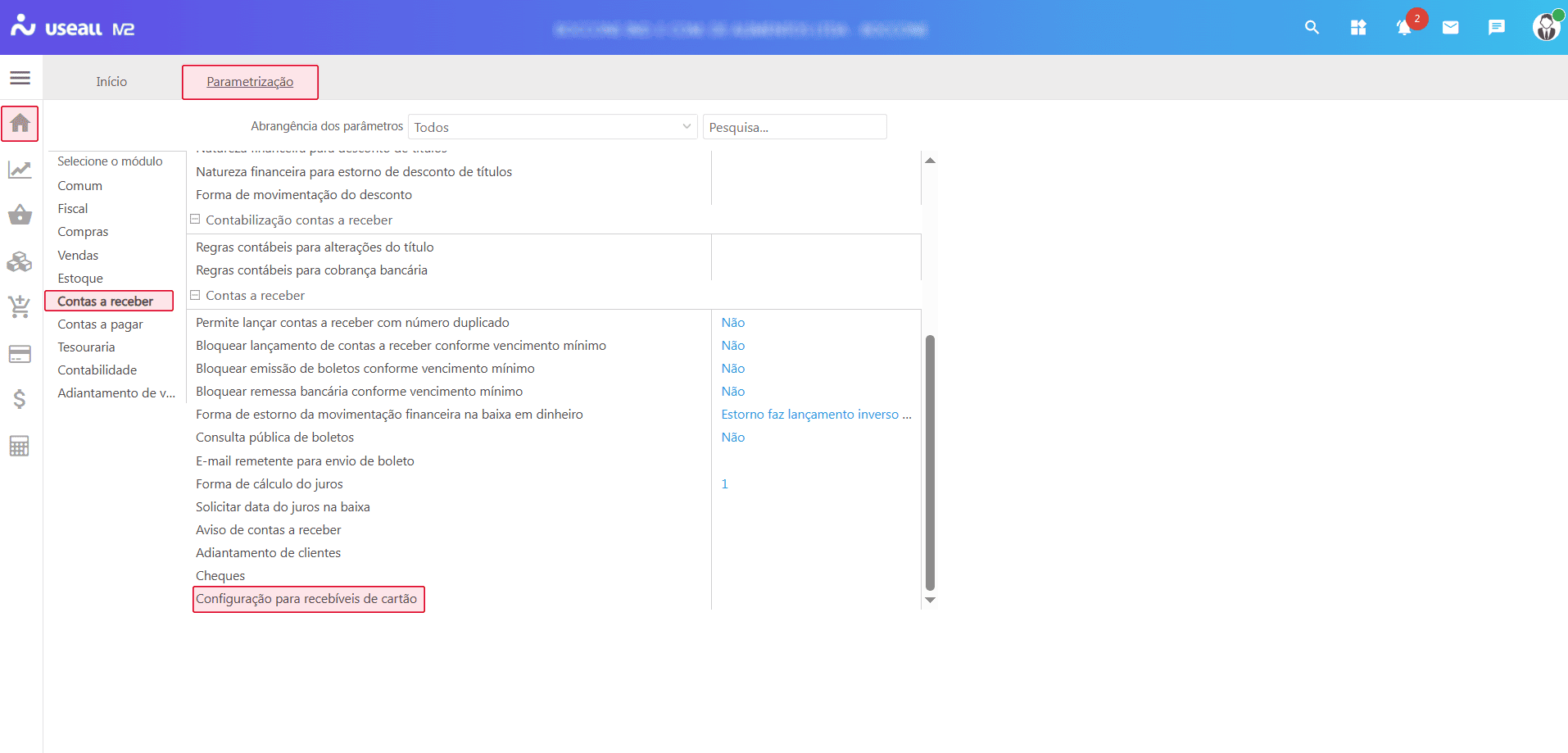 Para utilizar o recurso, deve-se realizar a parametrização do Recebíveis de cartão disponível em: Início > Parametrização > Contas a receber > Configuração para recebíveis de cartão.