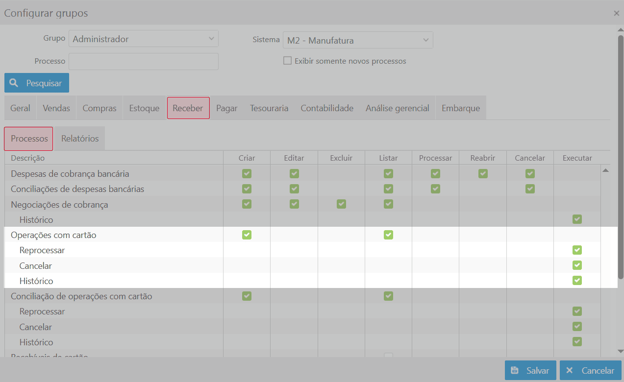 Logado no sistema USEALL deve-se acessar o Módulo Central, opção Usuários¹, selecionar o usuário que terá a permissão, clicar no botão Mais opções, opção Permissões de sistemas. Deve-se clicar na opção configurar do sistema M2-Manufatura, em seguida, acessar o módulo Receber e localizar a seção Operações com cartão, onde deve ser configurada as devidas permissões "Operações com cartão, reprocessar, cancelar e histórico".