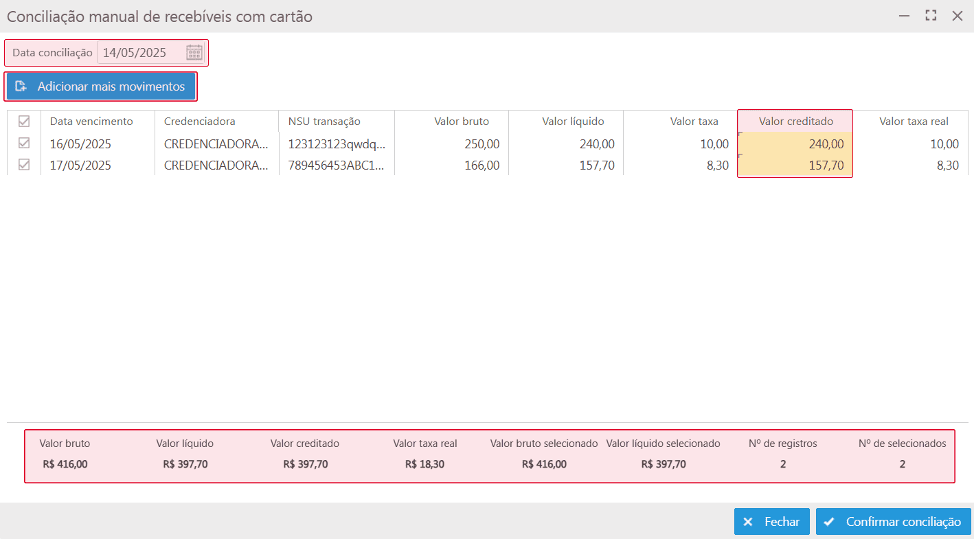 A tela apresenta a lista de registros selecionados para efetuar a conciliação, os totalizadores informando os totais de valor bruto, valor líquido, valor creditado, valor taxa real, valor bruto selecionado, valor líquido selecionado, nº de registros e nº de selecionados. O campo "Valor creditado" (destacado em amarelo) é editável e permite gerar acréscimos ou descontos na baixa. No entanto, não é permitido inserir um valor superior ao valor bruto.