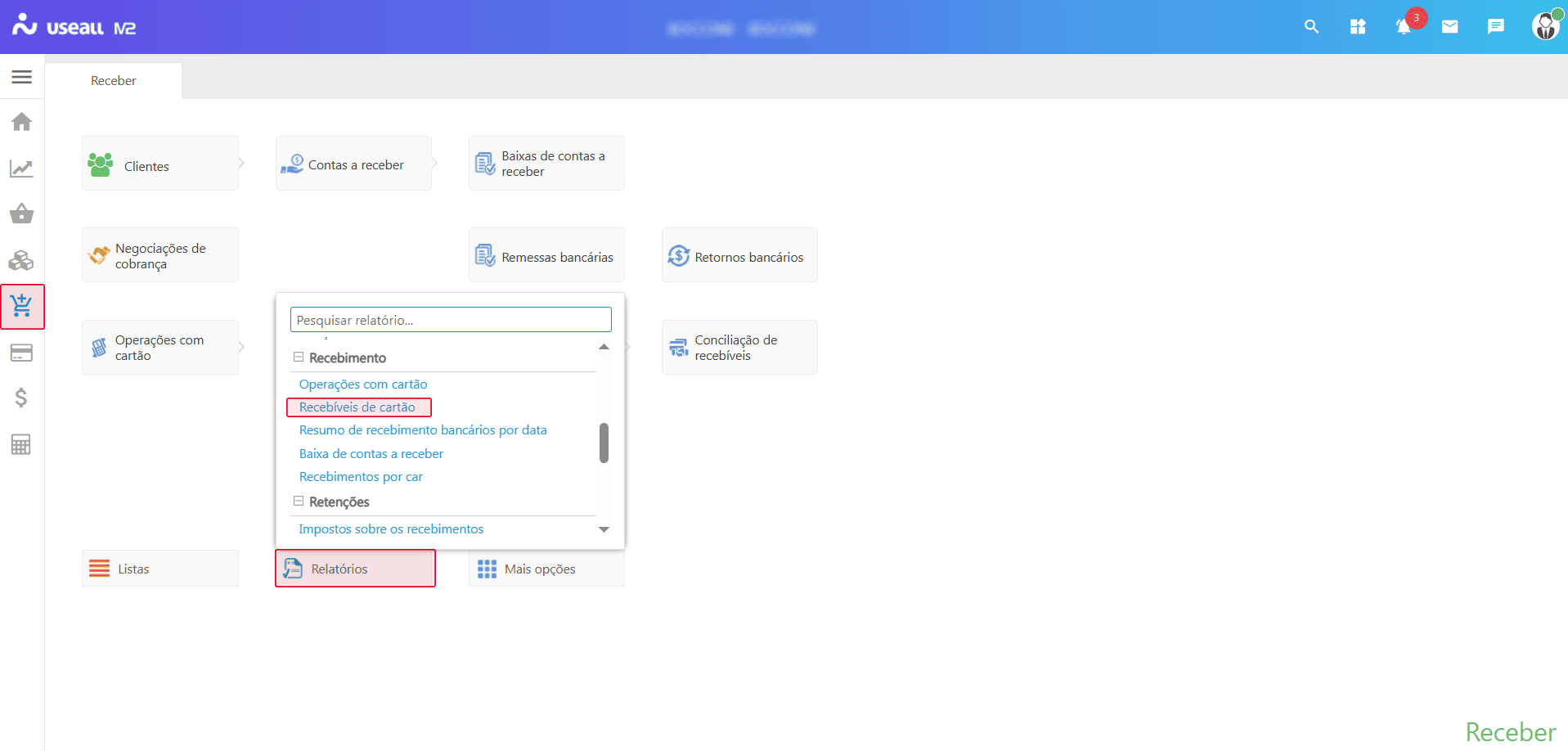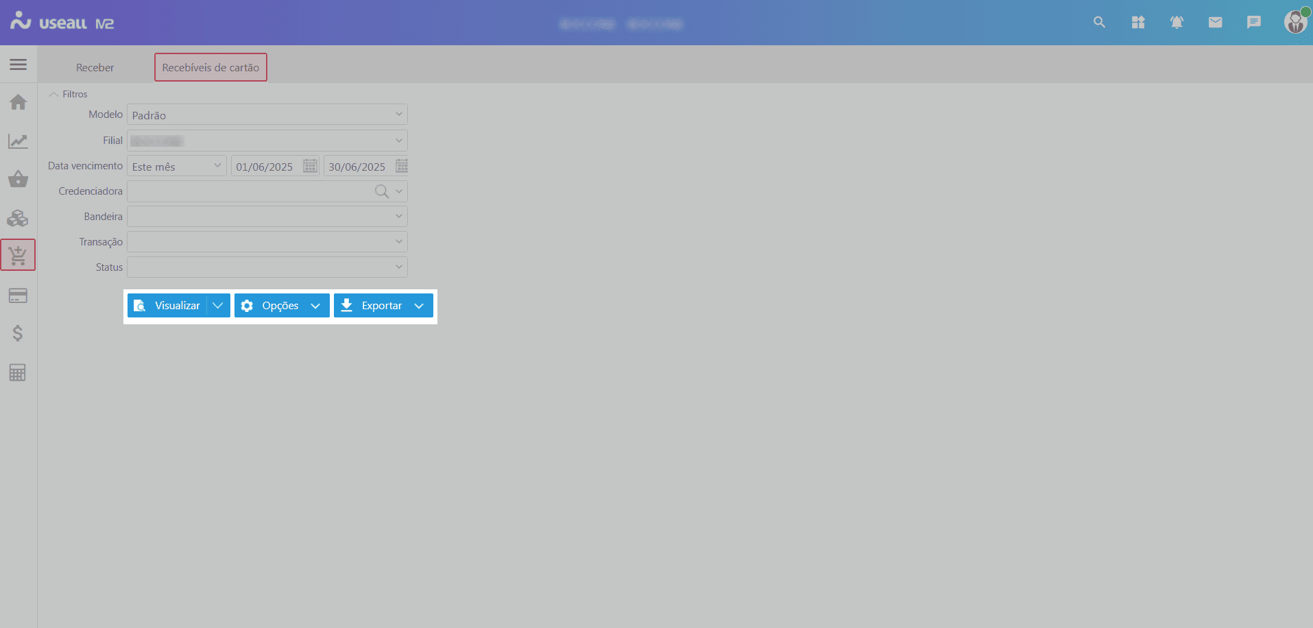 O relatório Recebíveis de cartão tem como finalidade fornecer visibilidade sobre o fluxo de receitas, apoiar a conciliação financeira e subsidiar o planejamento de caixa e a tomada de decisões estratégicas.