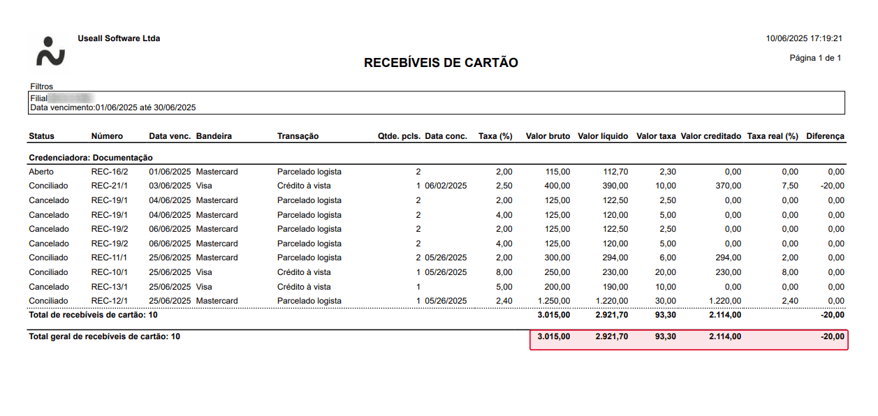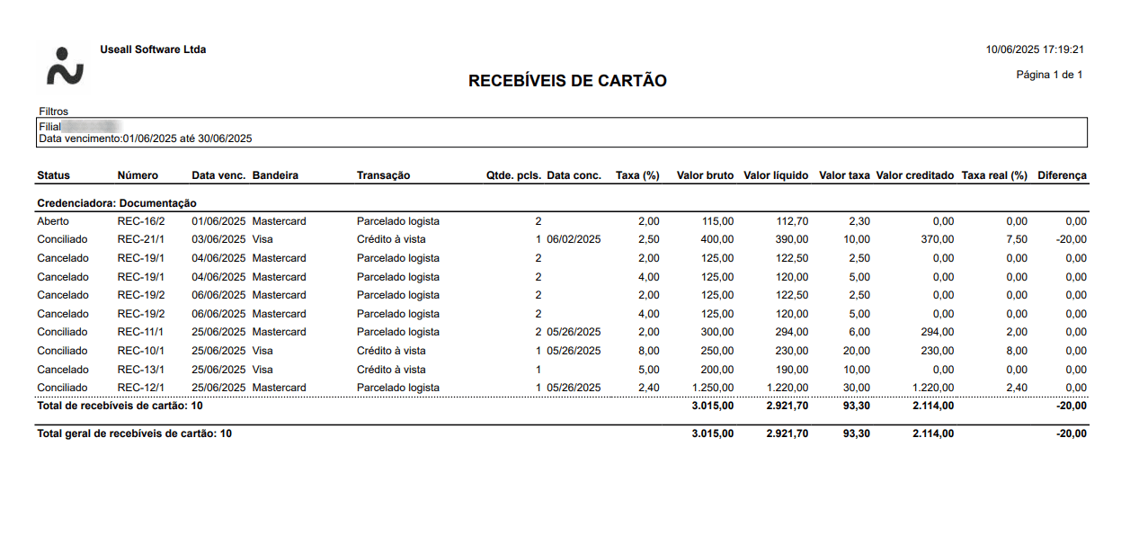Relatório Recebíveis de cartão
