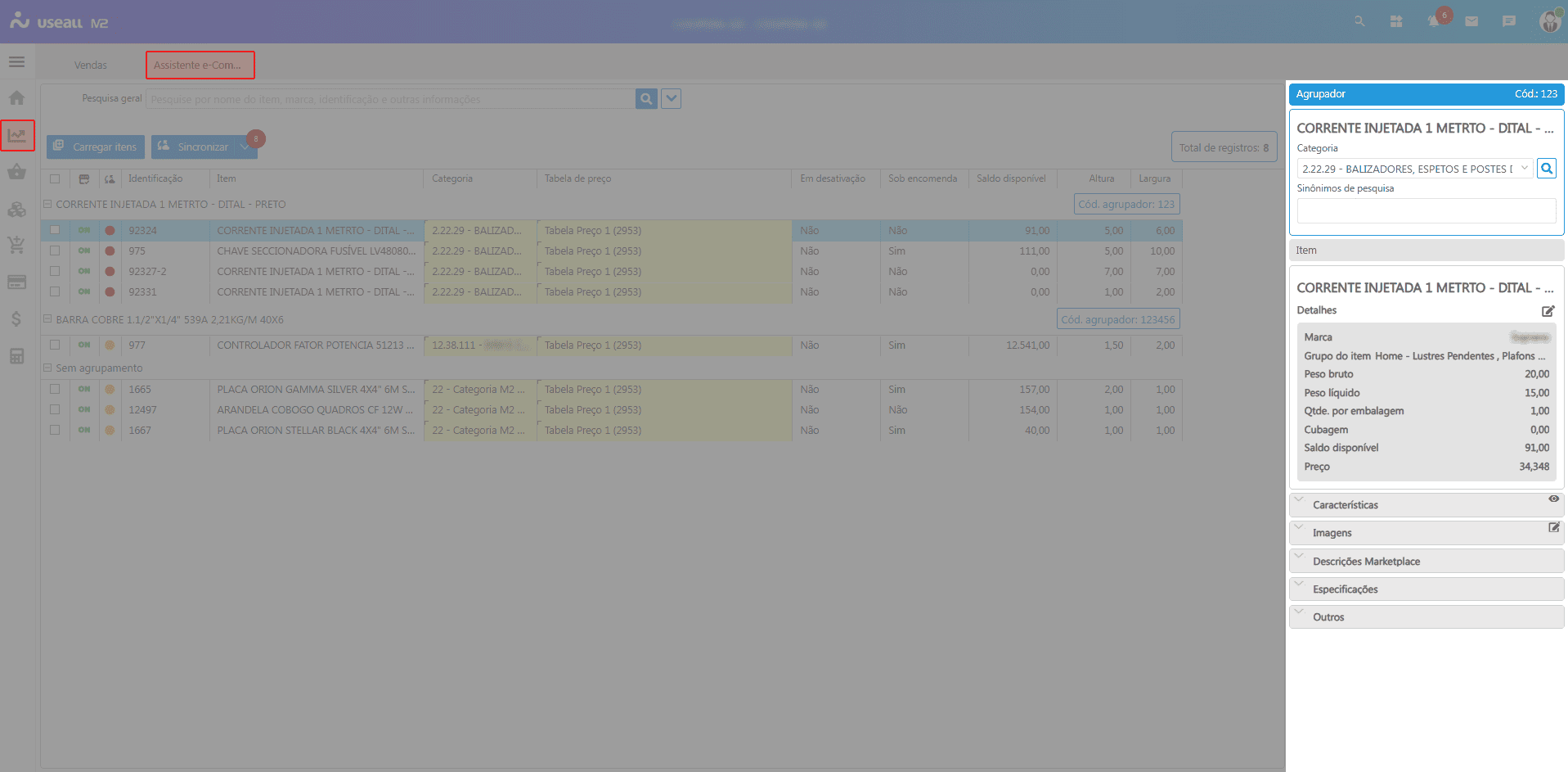 : este campo permite selecionar os itens que poderão ser editados, agrupados/desagrupados, liberar ou retirar do e-Commerce;