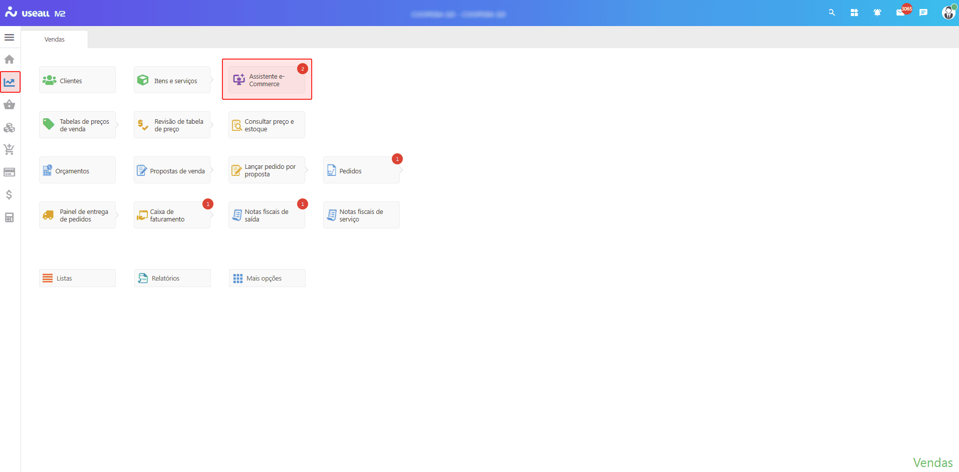 Para utilizar a ferramenta de Assistente e-Commerce, é necessário realizar a parametrização disponível em Início > Parametrizações > Vendas > Assistente e-Commerce.