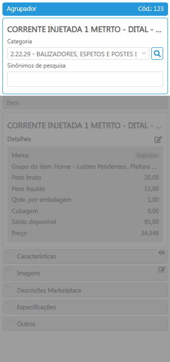 Neste quadro pode-se informar o Nome do item, selecionar uma Categoria, informar os Sinônimos de pesquisa, serão apresentados as seguintes informações Marca, Grupo do item, Peso bruto, Peso líquido, Qtde. por embalagem, Cubagem, Saldo disponível e Preço.