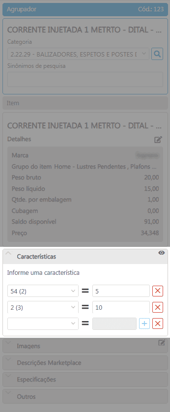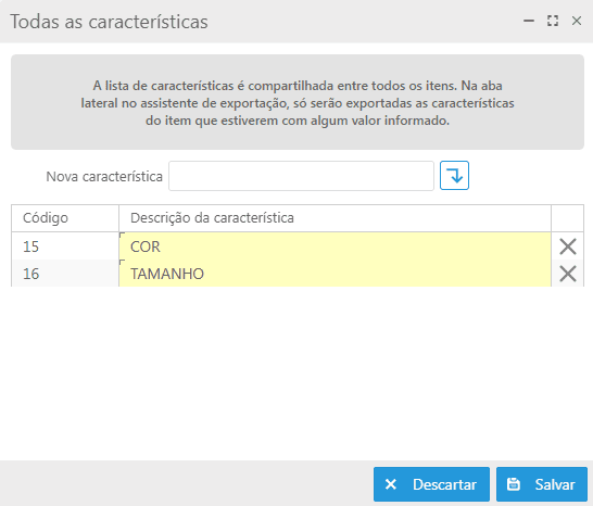 Ao clicar no ícone irá abrir a tela para cadastrar as características para o item.
