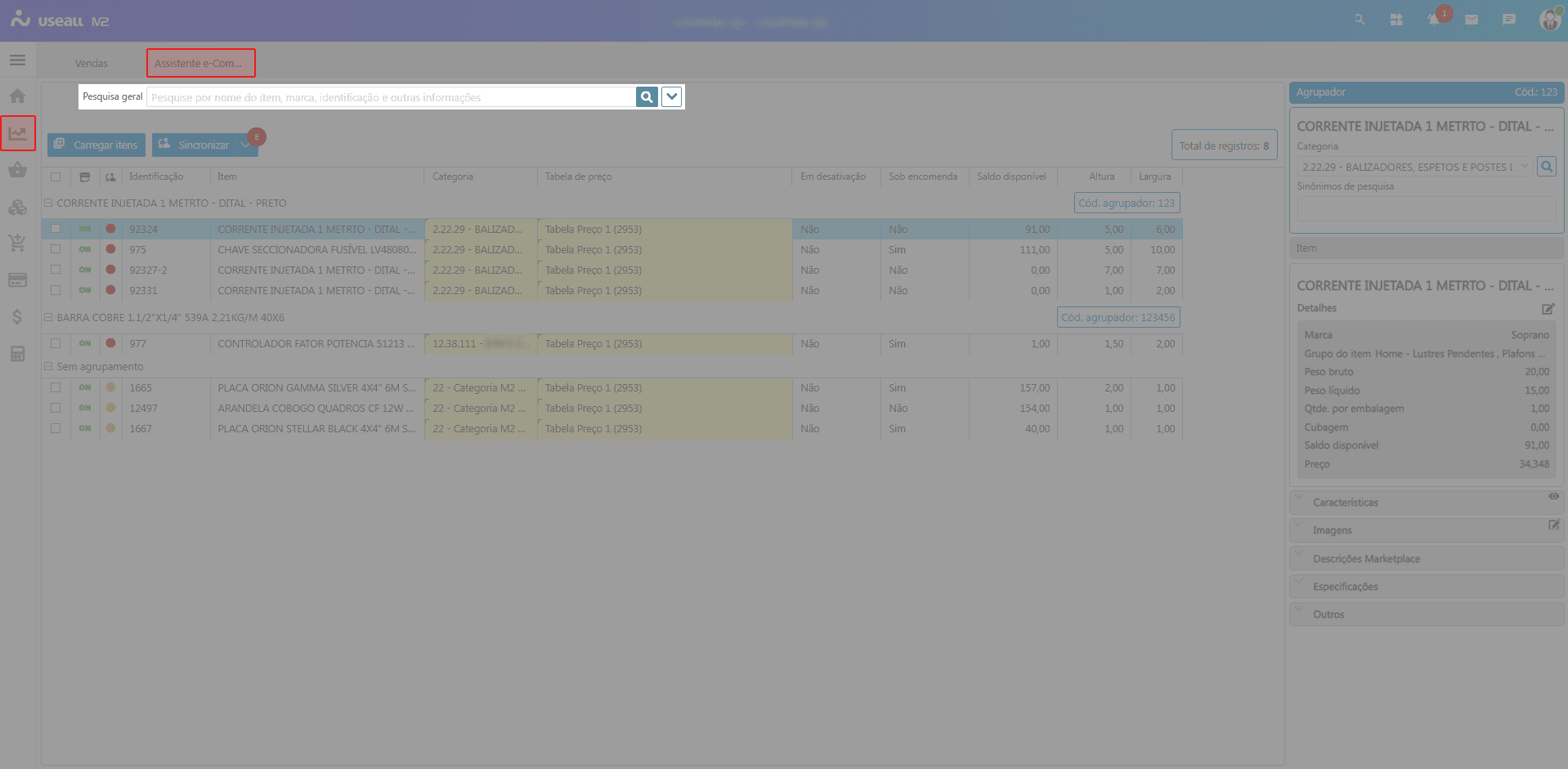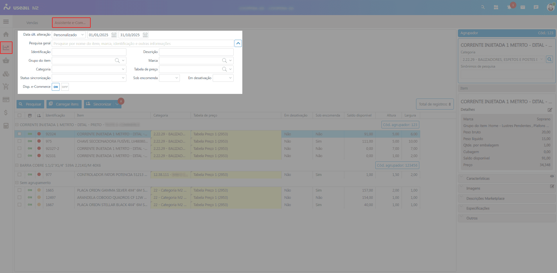 Ao acessar a funcionalidade Assistente de e-Commerce são exibidos os filtros e botão pesquisar, botão carregar itens, botão sincronizar, grid de informações e o aba lateral direita.