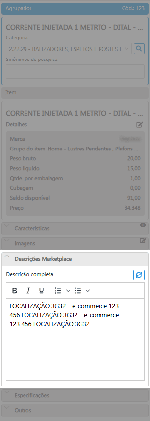 Este quadro é utilizado para preencher com as informações que serão apresentadas para o item no e-Commerce.