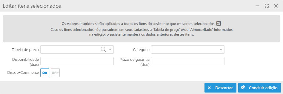 Não é possível marcar o item como disponível no Assistente se os campos Disponibilidade (dias) e Prazo de garantia (dias) não estiverem preenchidos.