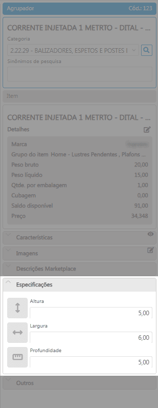 Altura, Largura e Profundidade: estas informações são preenchidas no quadro Especificações;