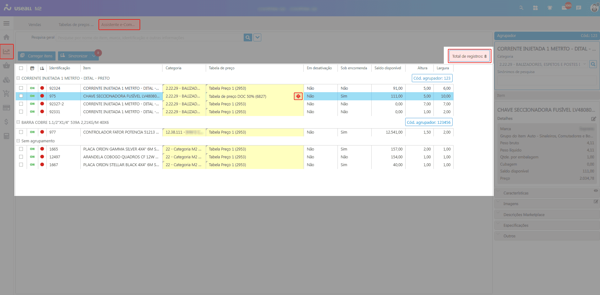 Caso existam itens com tabela de preço inativa ou itens inativos dentro da tabela de preço, será exibido um indicativo no Assistente e-Commerce.