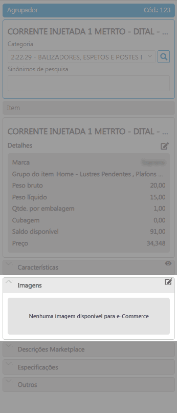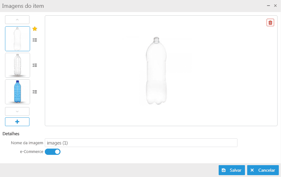 e-Commerce: quando marcado, indica que a imagem selecionada será exibida no Marketplace para o item, quando desmarcado indica que esta imagem não será exibida.
