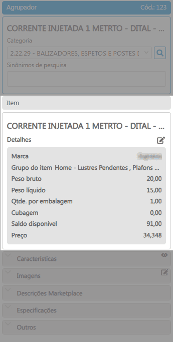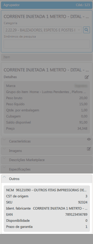 Neste quadro serão apresentadas outras informações do item, como: NCM, CST de origem, SKU, Ident. fabricante e EAN, disponibilidade e Prazo de garantia.
