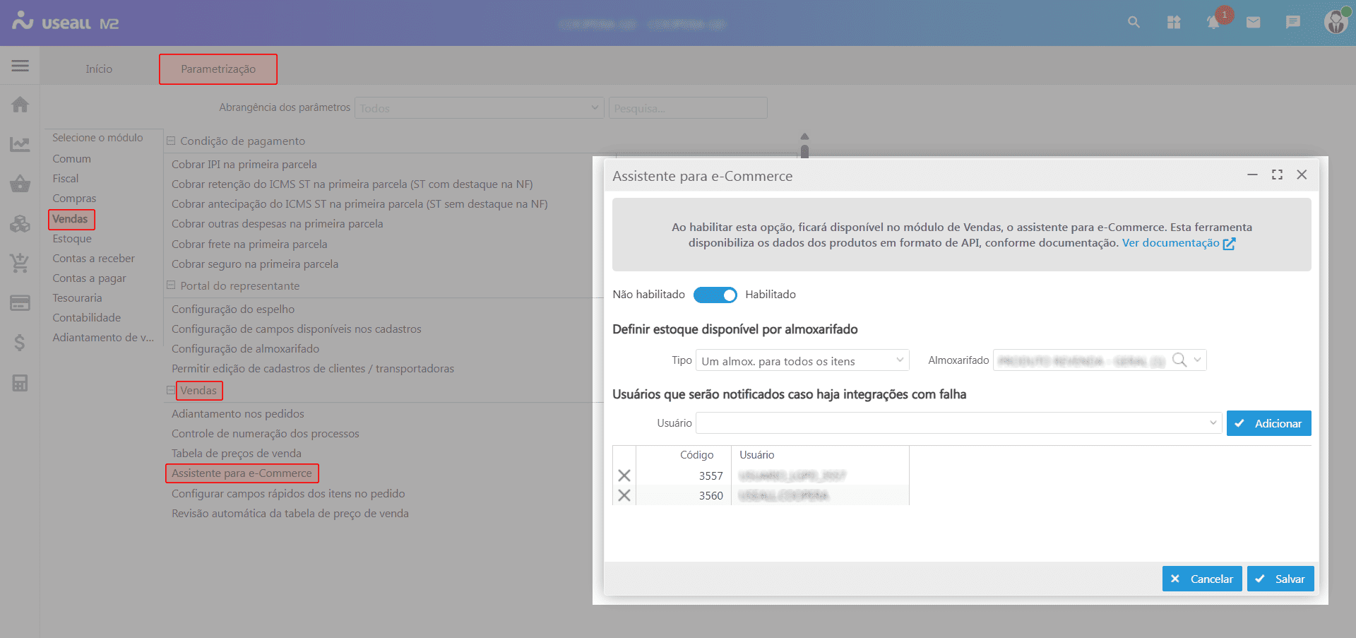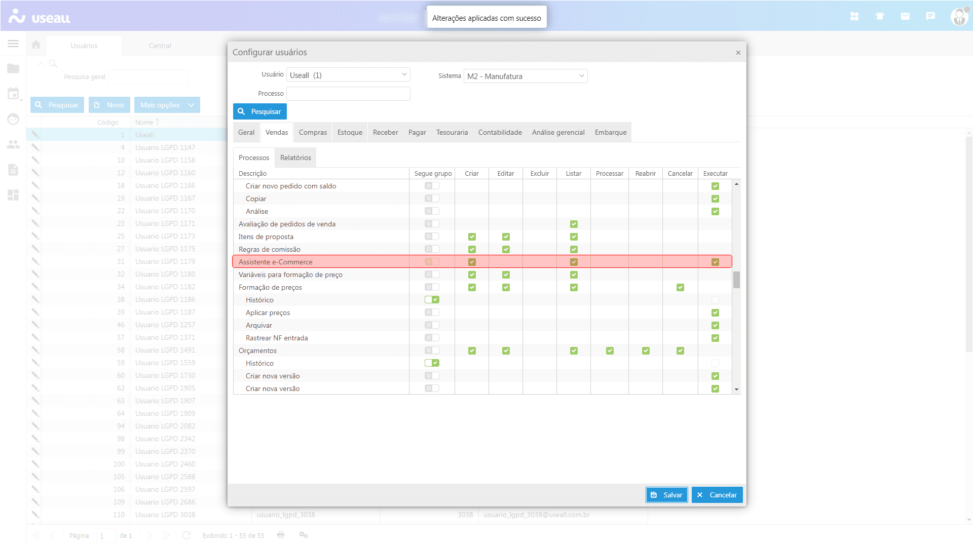 Logado no sistema USEALL deve-se acessar o Módulo Central, opção Usuários, selecionar o usuário que terá a permissão, clicar no botão Mais opções > Permissões de sistema. Deve-se clicar na opção configurar do sistema M2-Manufatura e, em seguida, clicar no módulo Vendas e por fim localizar a permissão Assistente e-Commerce.