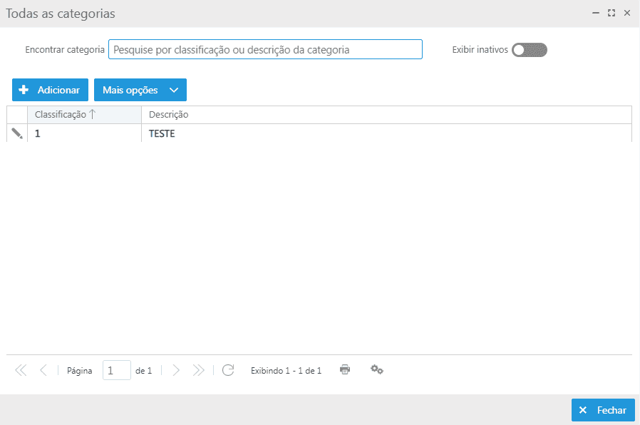 ao lado do campo Categoria, irá abrir a tela que apresenta as categorias disponíveis, possibilitando ativar, desativar, editar e cadastrar categorias.