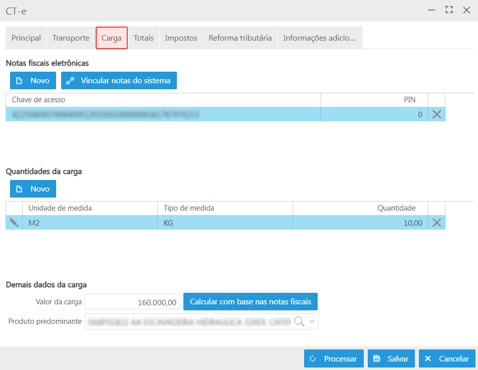 Botão Calcular com base nas notas fiscais: preenche automaticamente o valor da carga somando os valores das notas vinculadas;