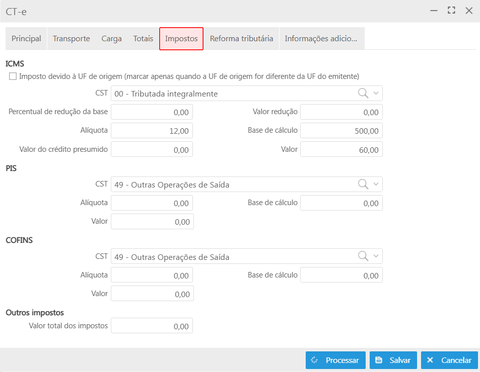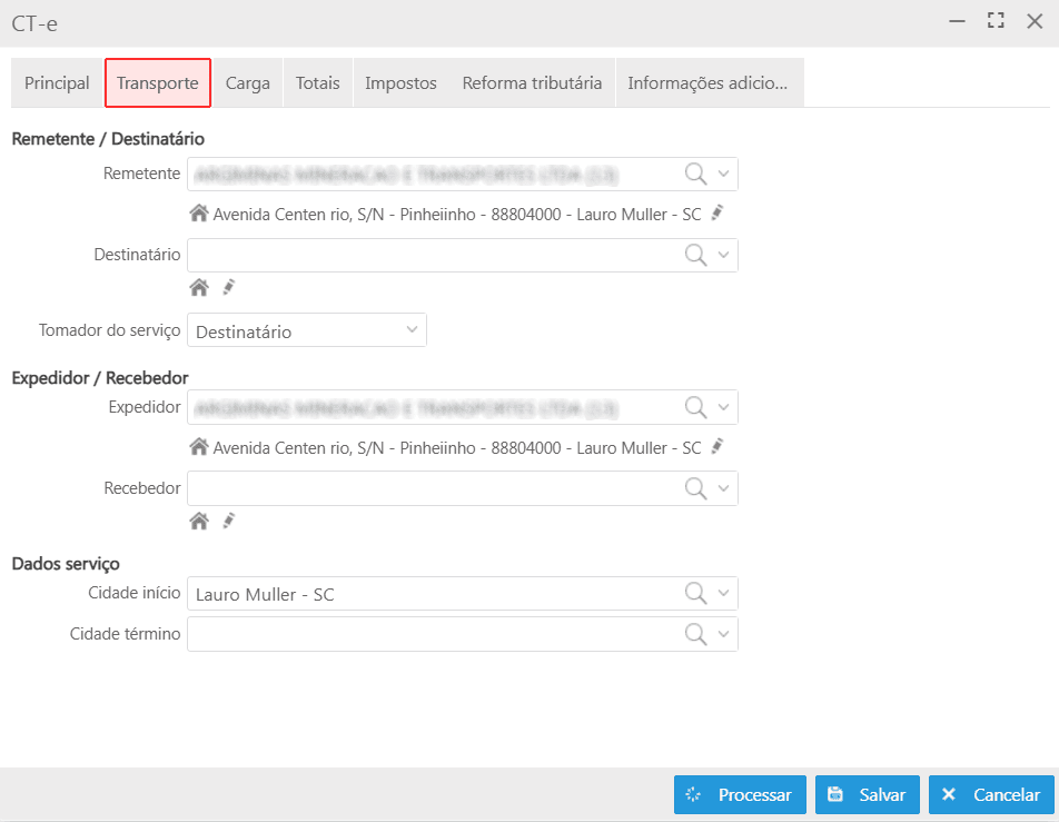 Processar: efetiva o CT-e, enviando-o para validação conforme as regras fiscais e operacionais cadastradas;