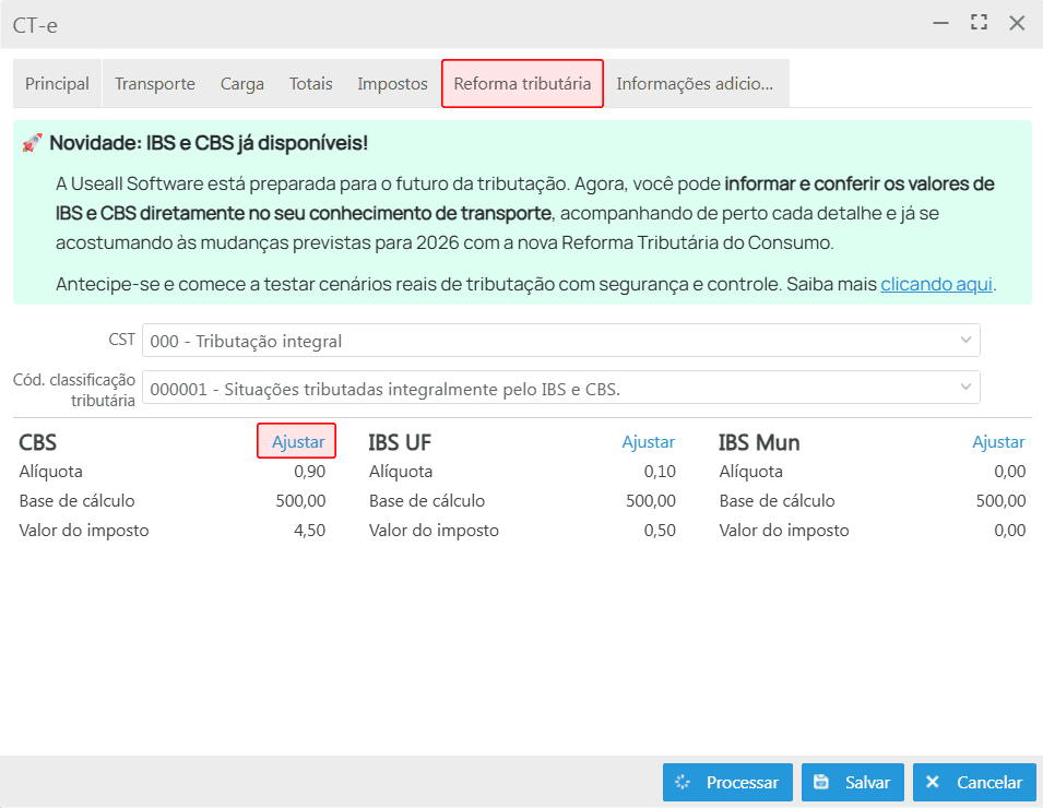 Link Ajustar: ao acionar, é exibida a tela CBS permitindo a edição.