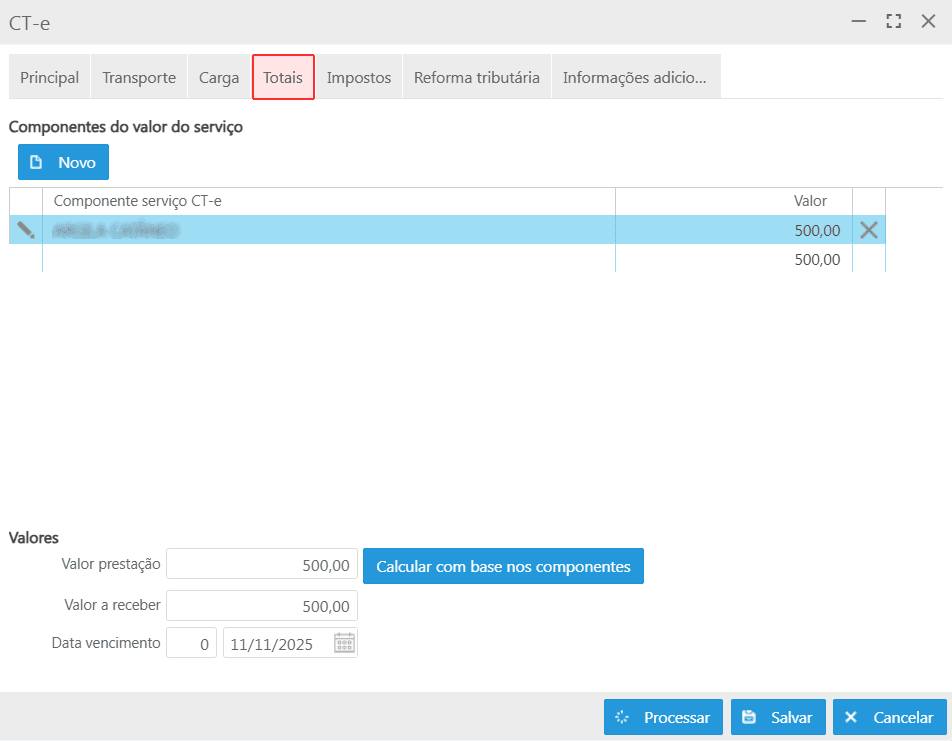 Para que o botão Calcular com base nos componentes atualize corretamente o valor da prestação, é necessário que todos os componentes estejam previamente registrados na seção Componentes do valor do serviço.