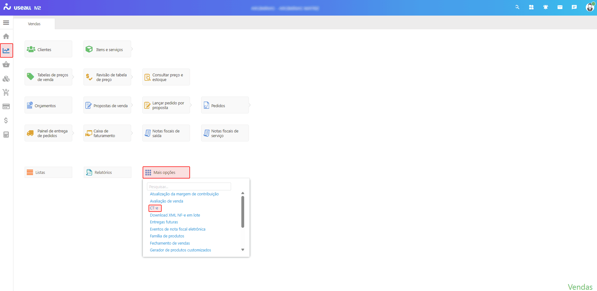 O acesso está disponível no Módulo Vendas > Mais opções > CT-e.