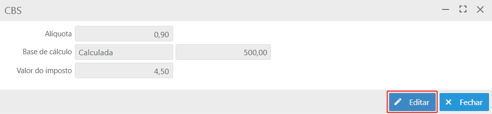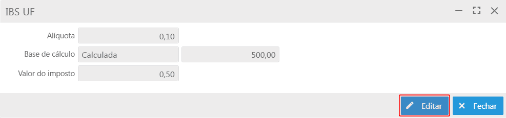 Para liberar os campos para edição, deve-se acionar o botão Editar. Os campos Alíquota e Base de cálculo ficam disponíveis para atualização manual;