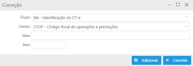 Ao acionar o botão Novo, a tela Correção será exibida, onde são informados o Grupo, o Campo, o Valor a ser corrigido e, quando aplicável, o Item relacionado.