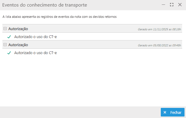 - Histórico: ao selecionar essa opção, o sistema exibirá o histórico de alterações, autorizações e eventos vinculados ao CT-e selecionado.