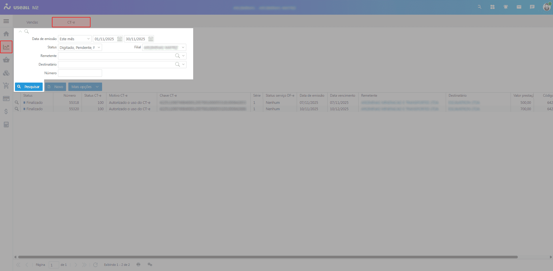 Ao acessar a funcionalidade de CT-e são exibidos os filtros e botão pesquisar, botão novo, grid de informações e o botão mais opções.