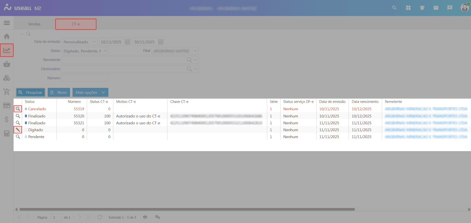 Na grid são apresentados os Conhecimentos de transportes (CT-es) conforme os filtros aplicados.